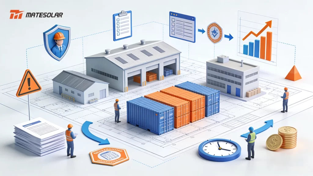 Tempo é dinheiro. Os atrasos nos projectos equivalem diretamente à perda de receitas e a períodos de retorno mais longos. A complexidade da implementação do armazenamento em contentores - envolvendo logística internacional, alfândegas, códigos eléctricos locais e obras civis - exige uma abordagem coordenada e de ponto único de responsabilidade.
